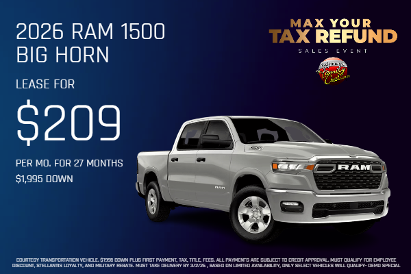 Courtesy Transportation Vehicle. $1995 DOWN plus first payment, tax, title, fees. All payments are subject to credit approval. Must qualify for Employee Discount, Stellantis Loyalty, and military rebate. must take delivery by 3/2/26 , based on limited availability, only select vehicles will qualify- Demo Special